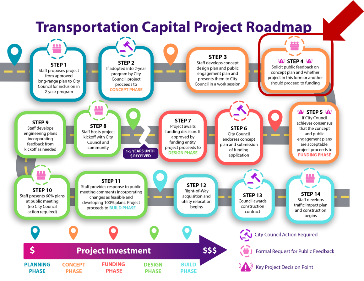 This project is in the “Concept” phase, near the beginning of the development process, and the subsequent phases have not been funded. This is a critical stage for community feedback; the city council needs input to determine whether this project should proceed. If there is consensus to proceed with this project, the council may direct staff to seek funding for design and construction.