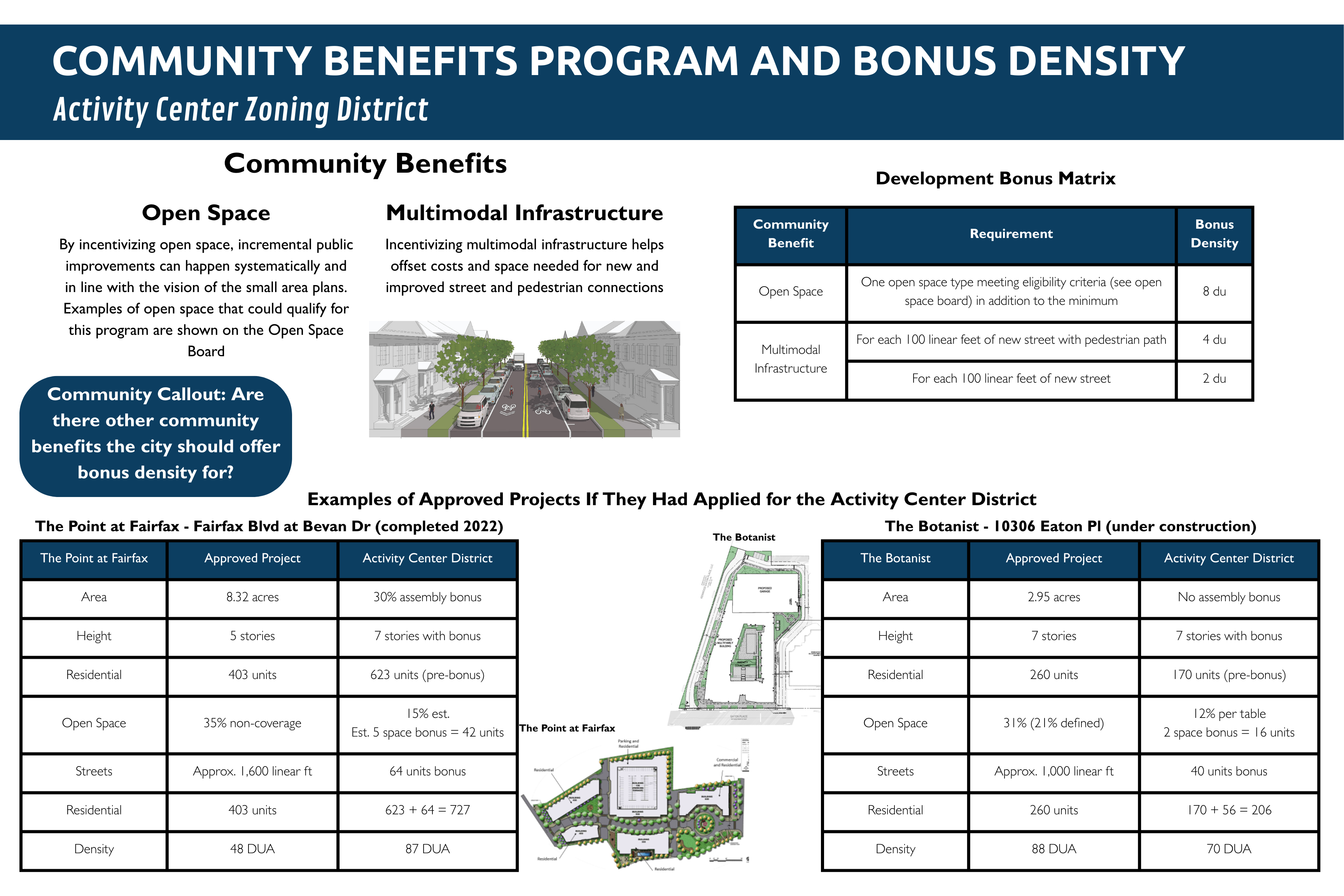 The community benefit bonuses listed in the draft amendments are for applicants who provide open space beyond standard requirements and/or portions of the transportation network. The bonuses that can be received are additional height and density.