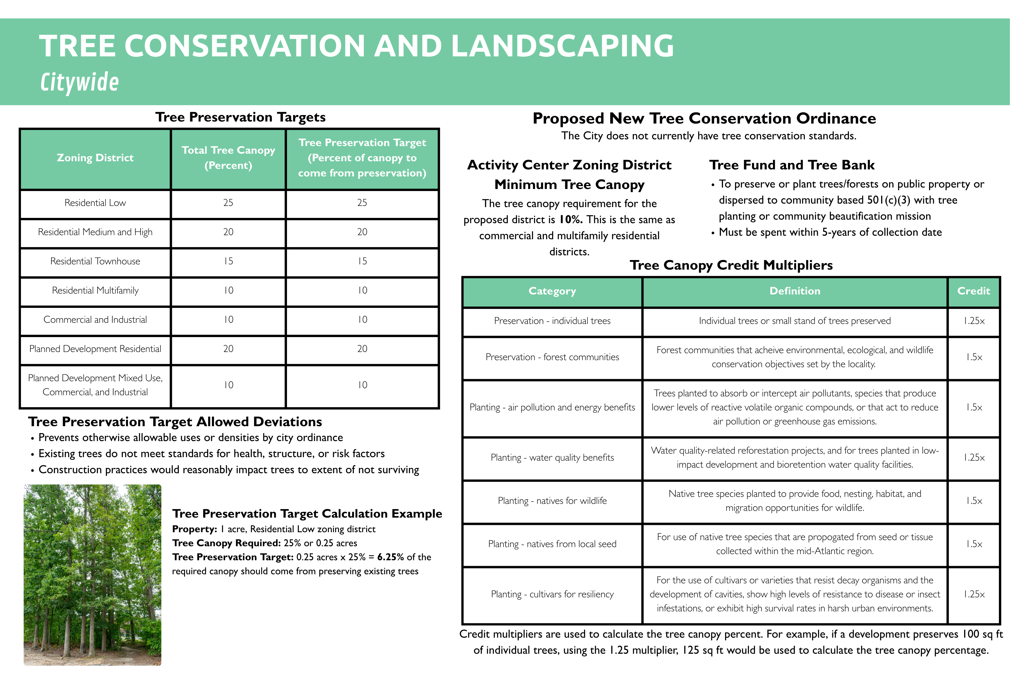 The Urban Forest Masterplan recommends establishing a Citywide Tree Conservation Ordinance. The ordinance will provide more structure to the City's tree standards in the Zoning Ordinance and other documents, and add standards for topics such as tree protection. This would apply citywide, not just in the proposed Activity Center zoning district.