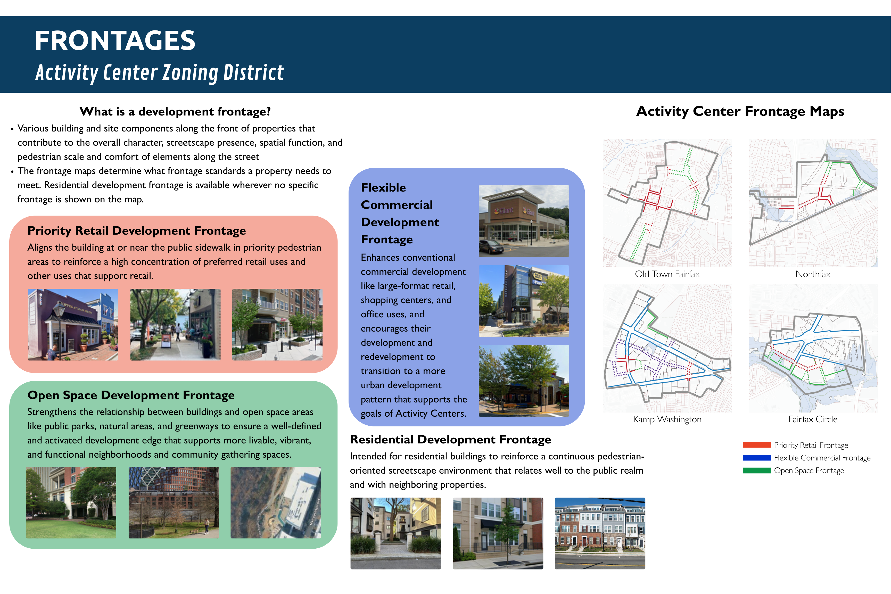 This is the primary "use" related topic in the draft amendments. Since the small area plans are generally flexible on uses and design of upper floors, most character defining elements are established on the ground floor of new development. This section establishes both use and design standards for the three frontage types described in the small area plans (priority retail, flexible commercial, and open space) and adds a general "residential" frontage in other areas.