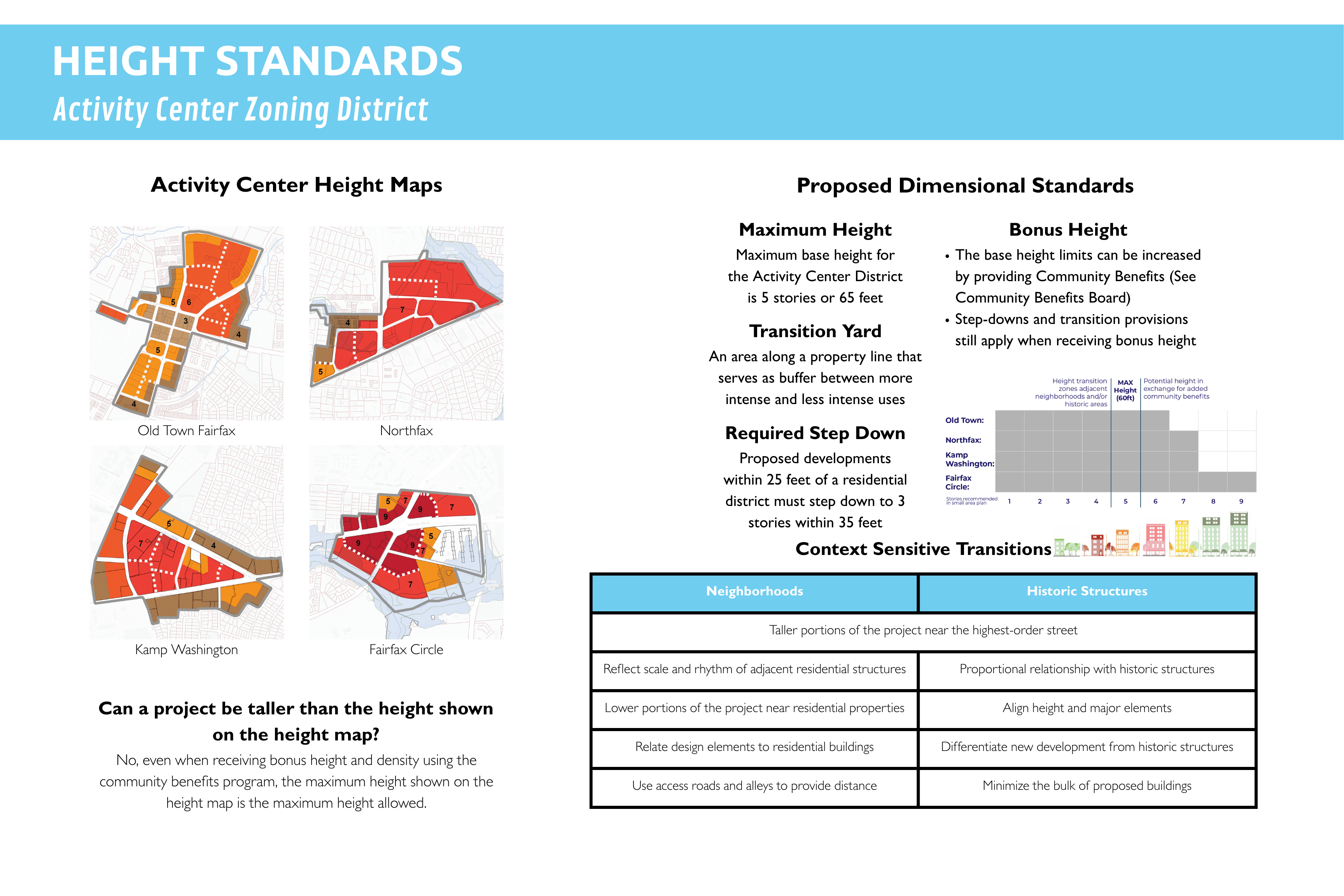 The proposed amendments include a required step down to residential neighborhoods and considerations for adjacent neighborhoods and historic structures.