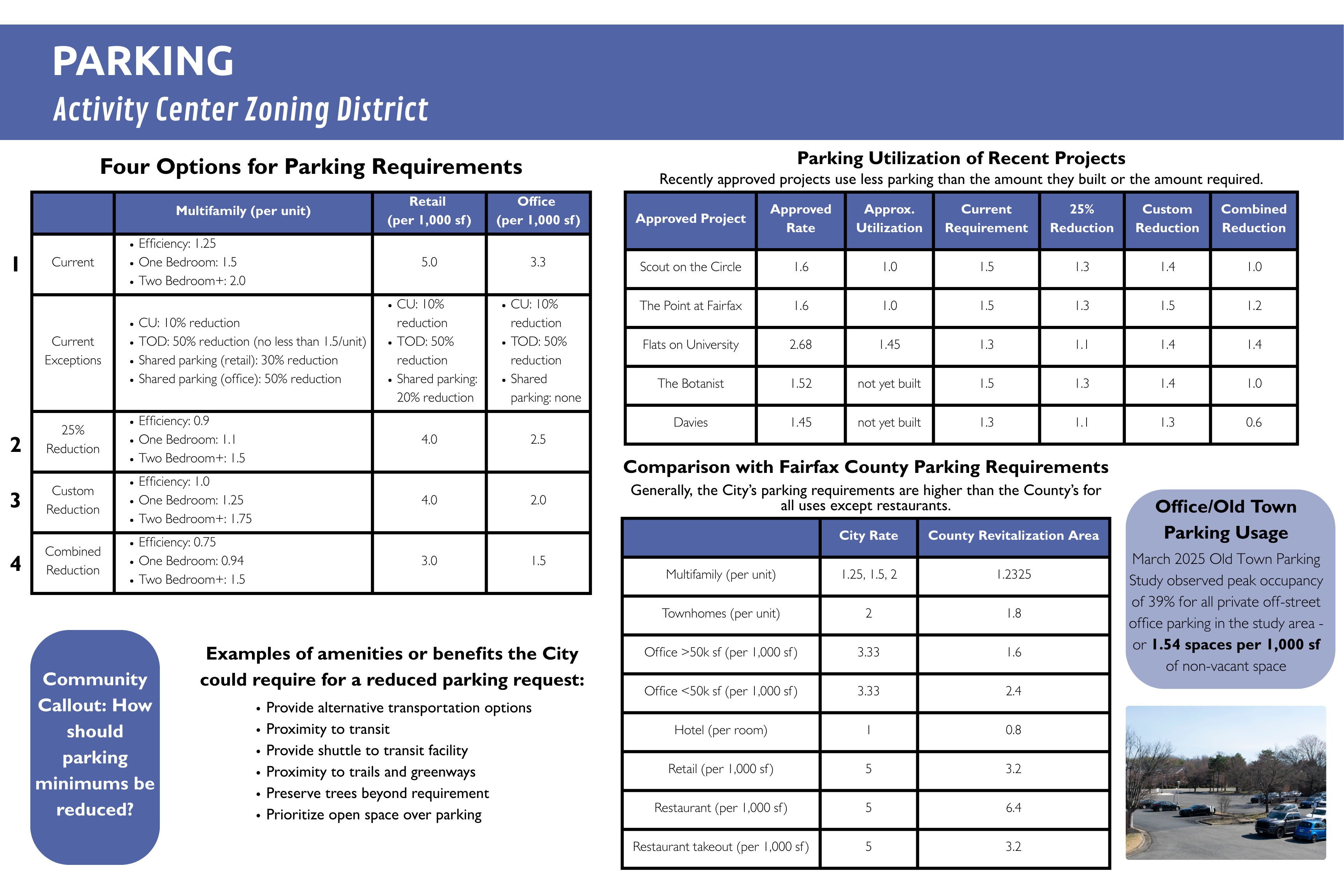 The draft amendments include options for parking reduction of up to 25% in activity centers if an applicant provides transportation related benefits and amenities.