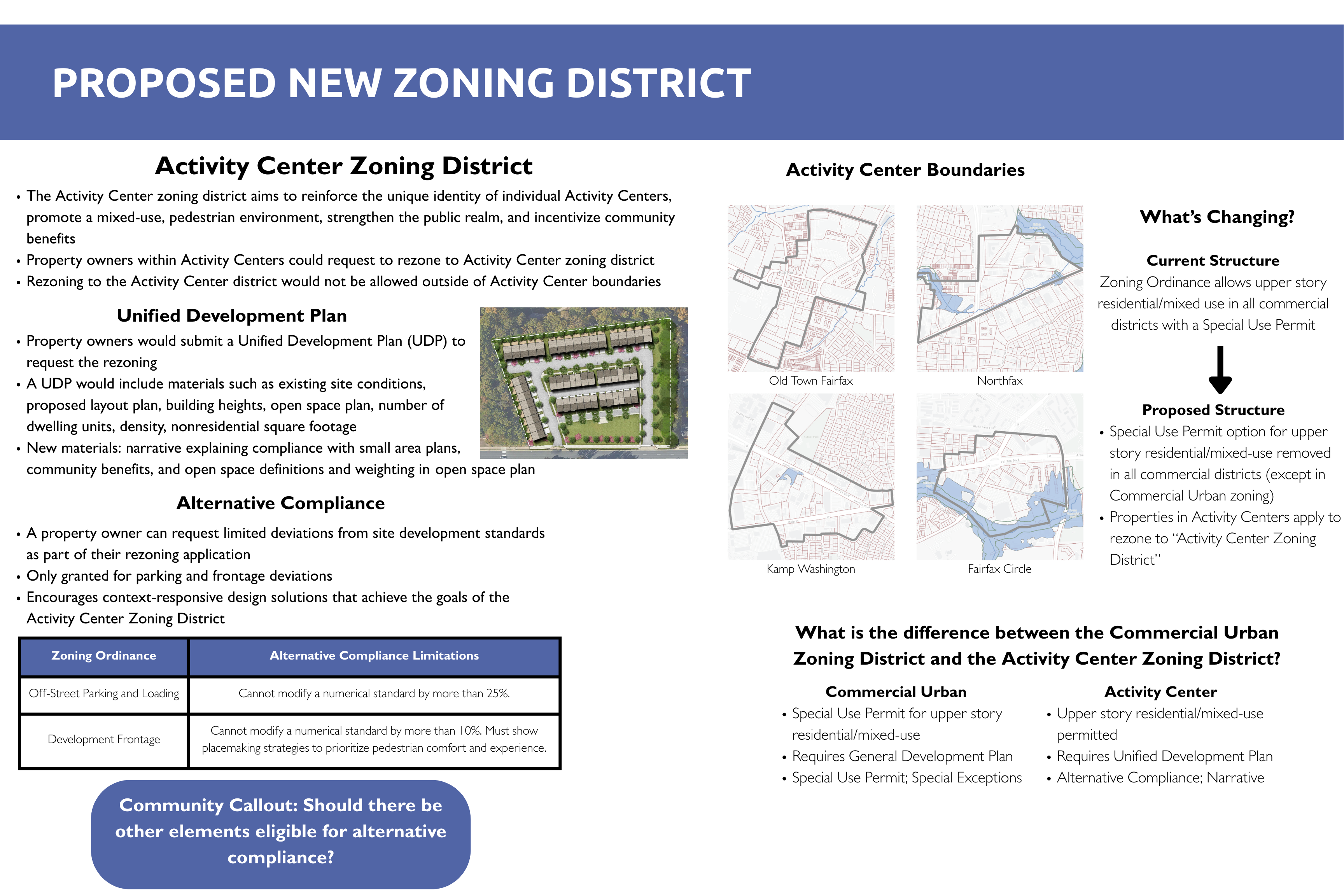 A rezoning request to this new proposed zoning district would require a Unified Development Plan which has a unique set of submission requirements that ensure enough information is provided by the applicant to allow proper review per the standards proposed in the Activity Center Zoning District.